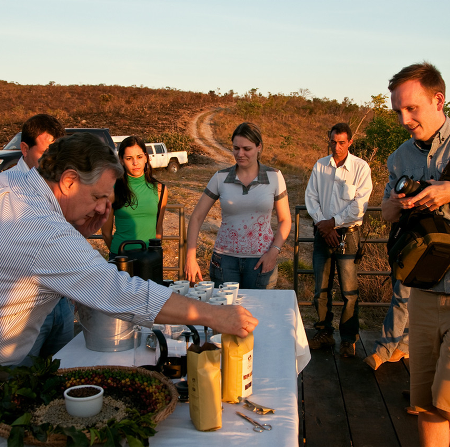 Luis deeply believes in the spiritual value of ceremonies. Here he is serving us and his staff French presses at the overlook as the sun sets. Andreza Elaine Mazarão stands in the center; she is the Director of Marketing and Customer Relations.