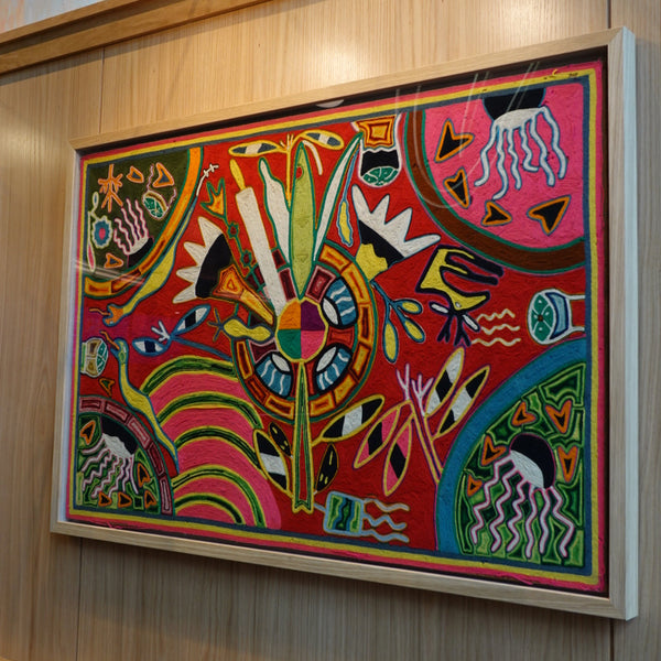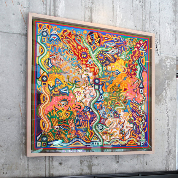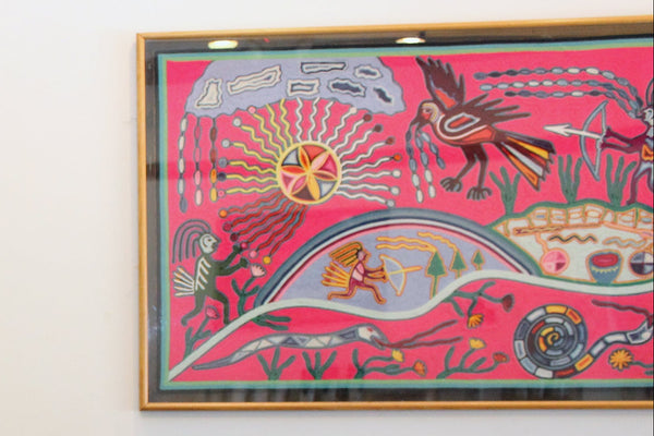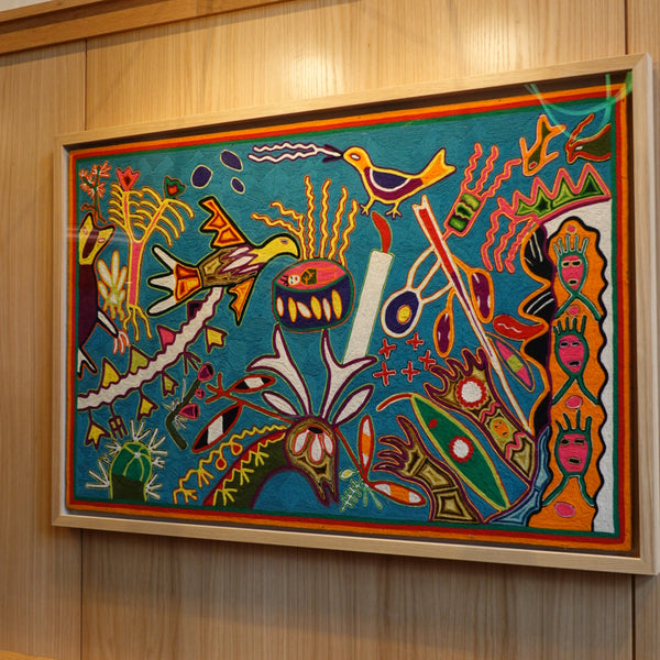 George and Laurie Howell have been collecting Wixarika art since the 1970s. The Wixarika people live north of Guadalajara, Mexico, deep within the Sierra Madre mountains. By remaining hidden in the canyons, they avoided direct confrontation with the Spanish armies, thereby preserving their religion and traditions intact. Their stories are shared through their yarn paintings - deeply spiritual artwork Created by coating wooden boards with softened native beeswax, into which each strand of yarn is meticulously pressed, one at a time.