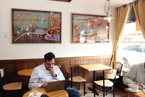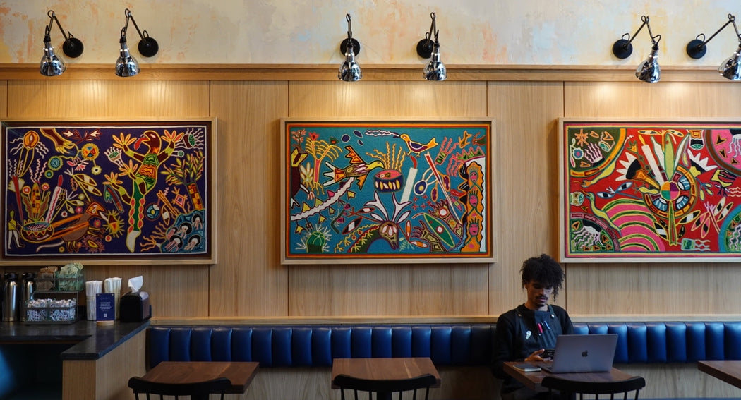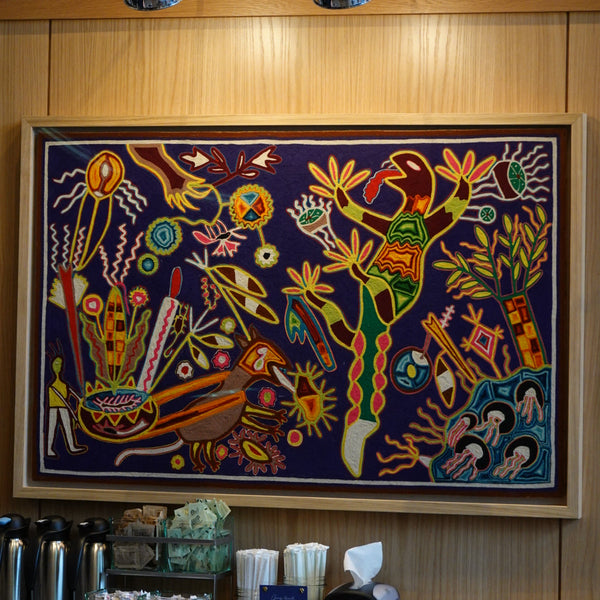 Today, George Howell Coffee's cafes and roastery also display Wixarika art. Before coffee, there was art. George continues to collect, restore, and recognize the incredible artwork of the nativa Wixarika people.