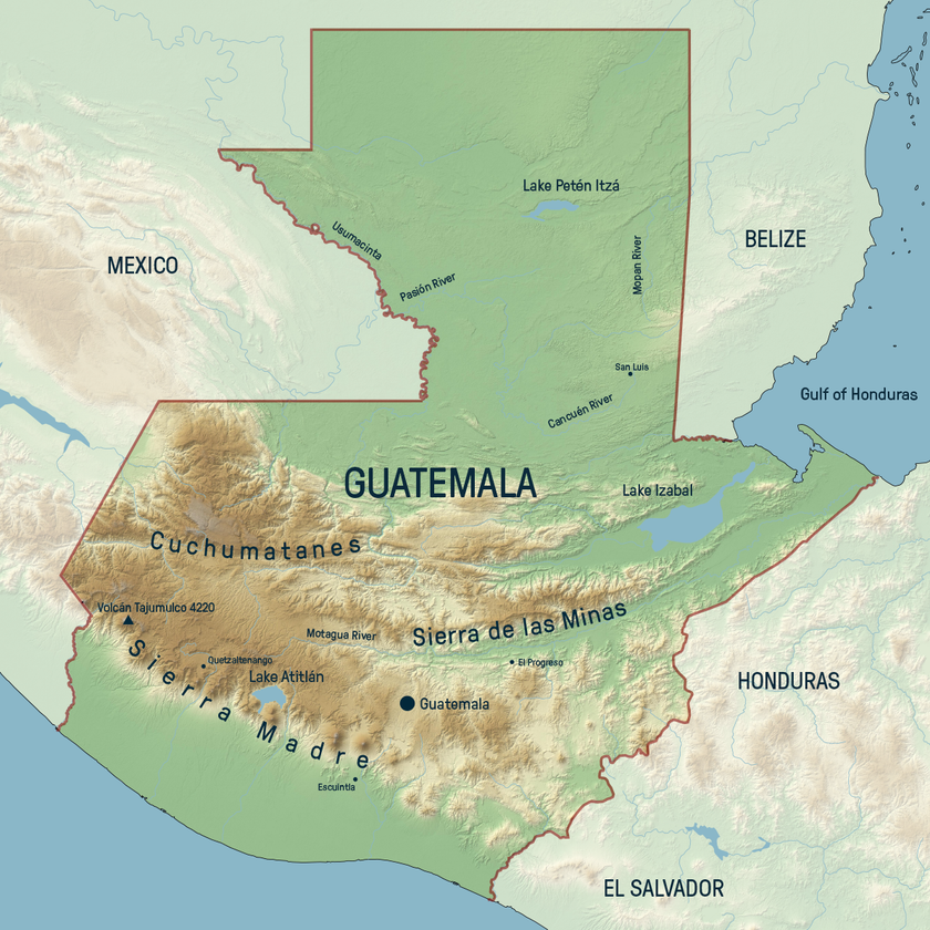 Physically, Guatemala is a mosaic of micro-environments intricately nested within and upon two very different mountain ranges, separated from each other by the Motagua River, bursting with power from the west and slowly diffusing toward the east. Both ranges rise above 13,000 feet, higher than anywhere else in Central America.