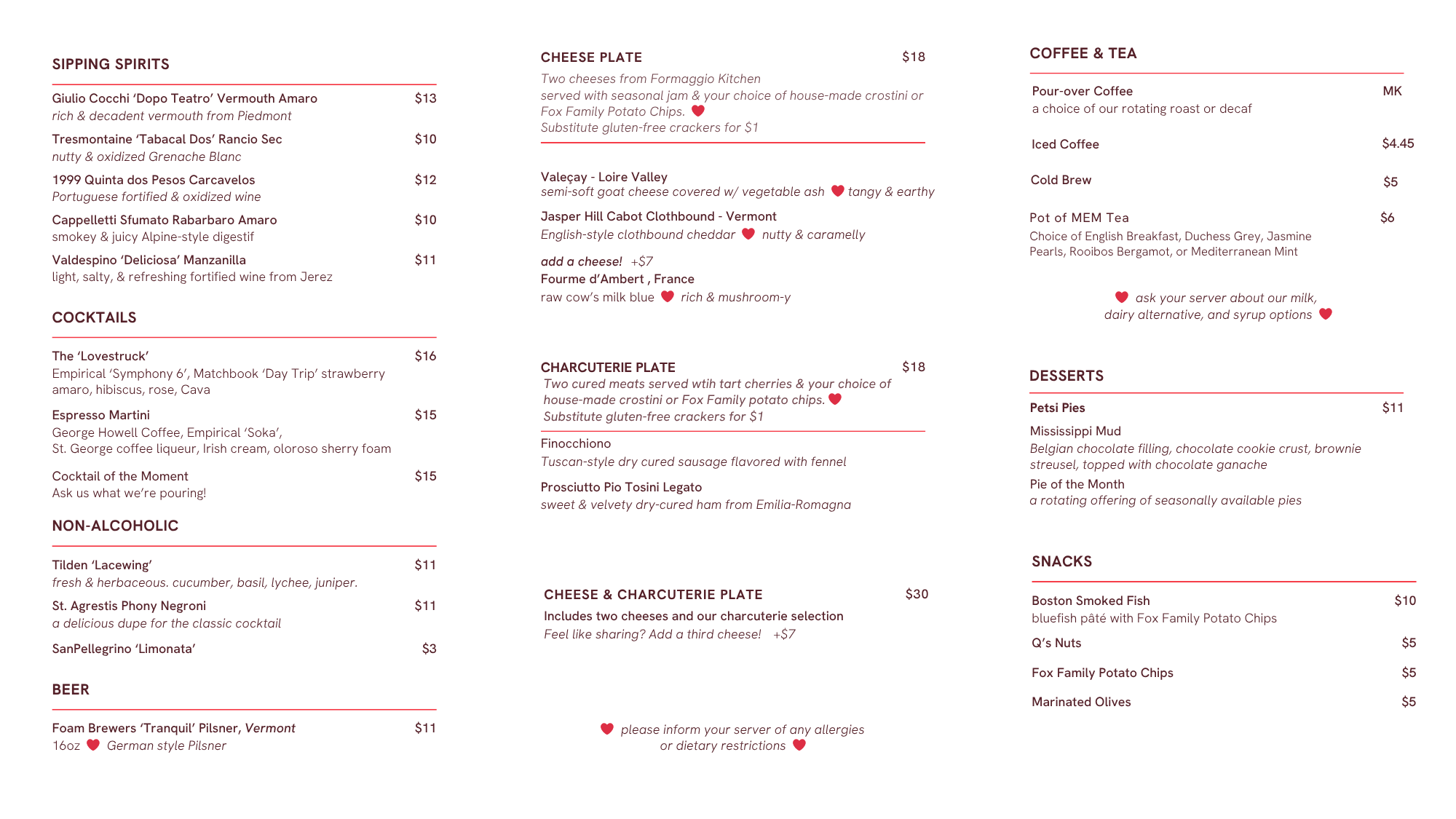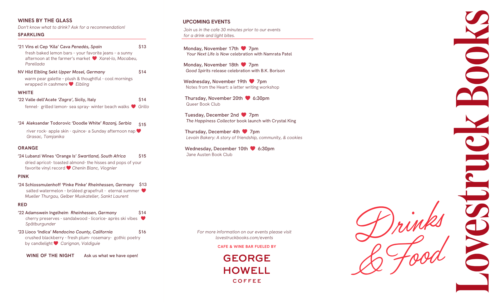Our cafe is open every morning at 8am. Wine is offered starting at noon with our full wine bar opening daily at 4pm. Enjoy coffee, tea, wine, cocktails, light bites and more.