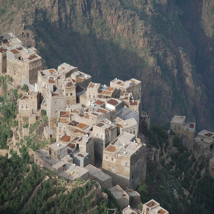 It is grown in Ans, Dhamar, Yemen, on high-elevation terraced farms (1,900–2,100m) where centuries of farming heritage, resilient families, and traditional methods yield coffee shaped by mountainous terrain and limited water resources.