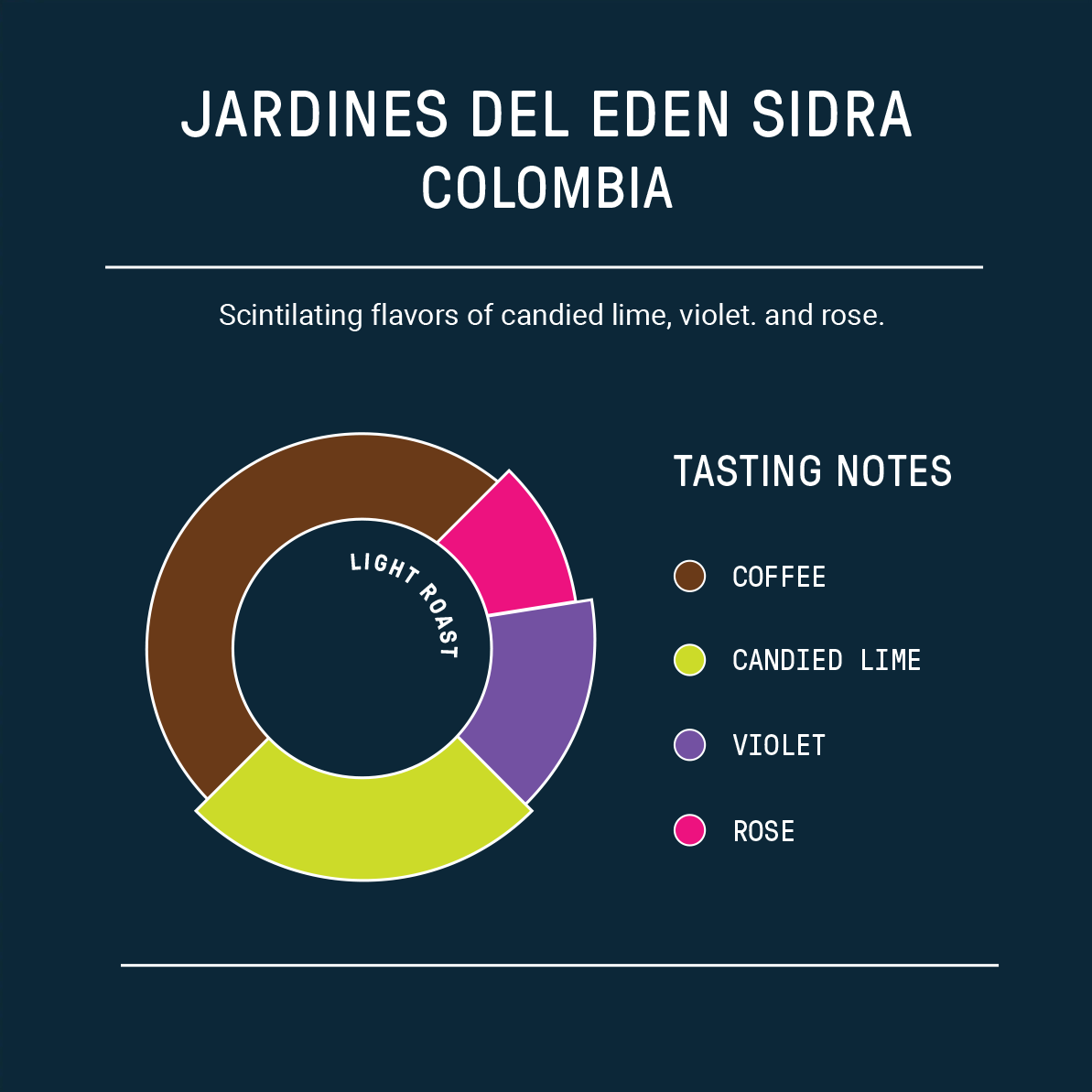Jardines del Eden (Garden of Eden) is a farm that specializes in exotic coffee varieties and experimental processing methods. This particular lot underwent anaerobic fermentation, where the cherries were sealed in a water-filled tank for 30 hours. After fermentation, the cherries were dried in temperature-controlled conditions, resulting in flavors of candied lime, violet, and rose.