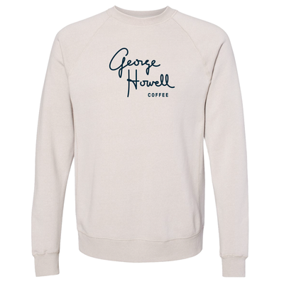 Unisex midweight crew neck sweatshirt in stone heather with navy font.