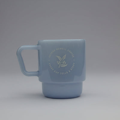 Our new blue milk glass mug featuring our new logo and "Every Cup Tells a Story" badge. Premium quality, vintage-inspired design perfect for coffee lovers.